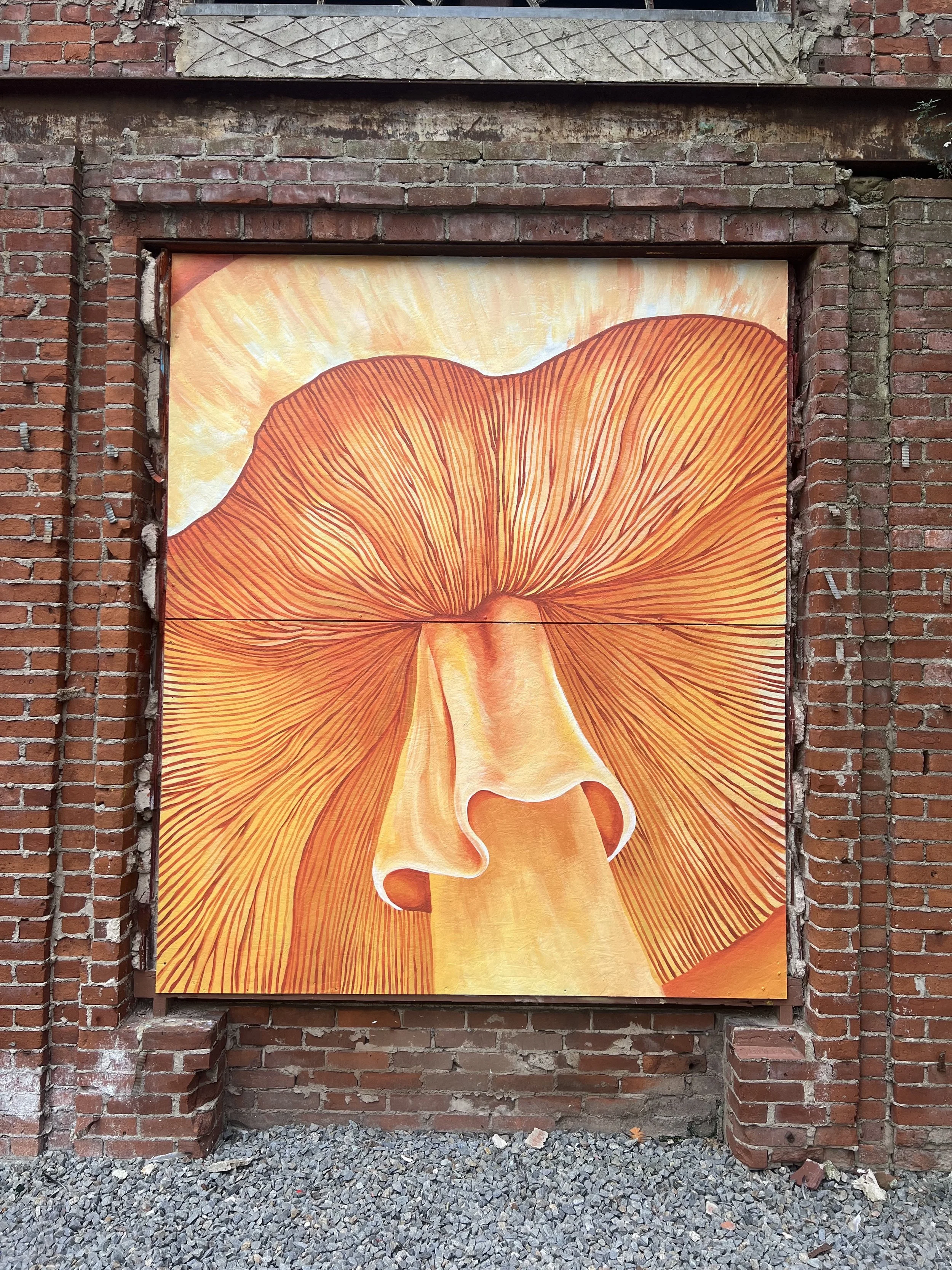 The project also draws from queer ecology, using fungi as a metaphor for breaking binaries in nature. The Split Gill, for instance, with its 23,000 sexes, serves as a queer icon in mycology. Inspired by recent discussions on the importance of fungi in publications like National Geographic, the mural aims to spark curiosity and reflection, fostering a deeper connection to nature while celebrating Rhode Island's rich biodiversity." -Maia Hay